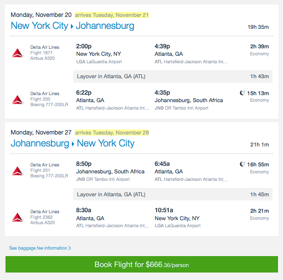 New York (LGA) to Johannesburg (JNB) for $666 round-trip via Priceline: