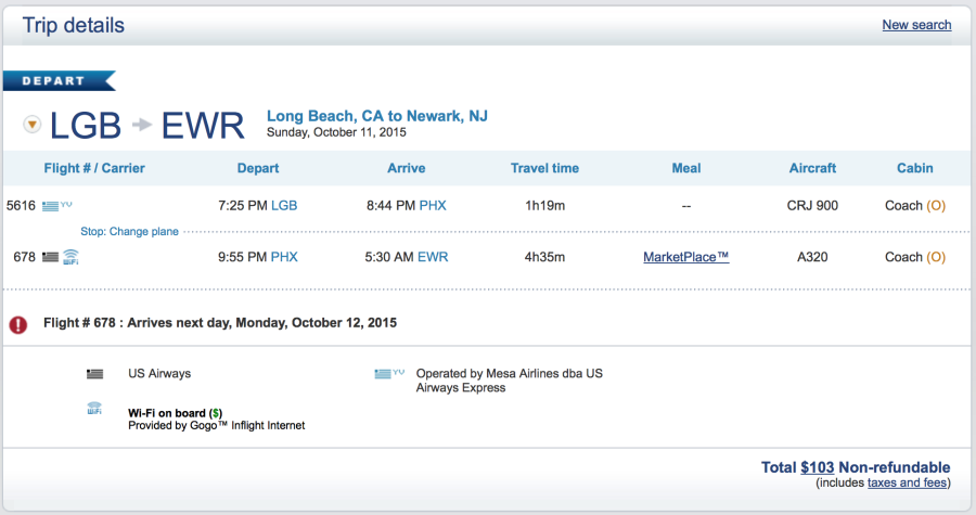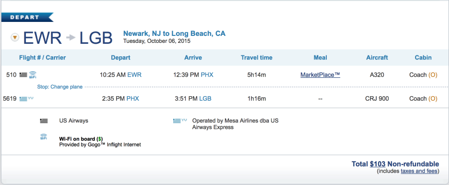 Long Beach to Newark for $103 one-way on US Airways (earns 2,488 EQMs):
