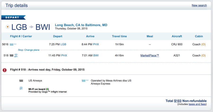 Long Beach to Baltimore for $103 one-way on US Airways (earns 2,354 EQMs):
