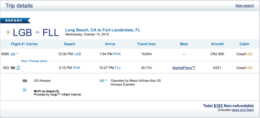 Long Beach to Ft. Lauderdale for $103 one-way on US Airways (earns 2,327 EQMs):