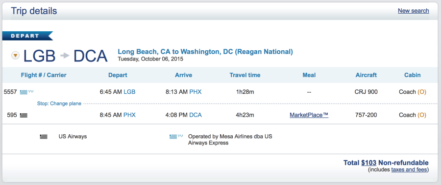 Long Beach to Washington D.C. for $103 one-way on US Airways (earns 2,334 EQMs):