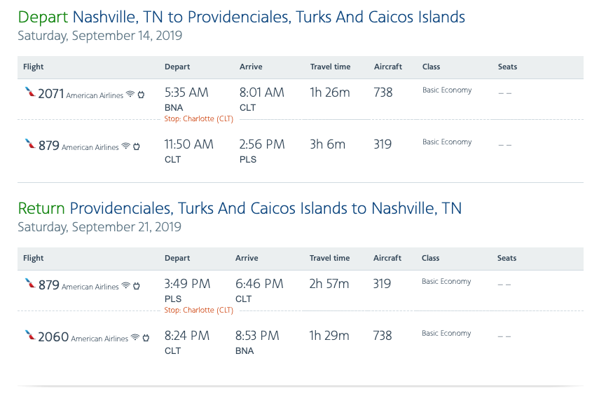 Nashville (BNA) to Providenciales (PLS) for $320 round-trip on American: