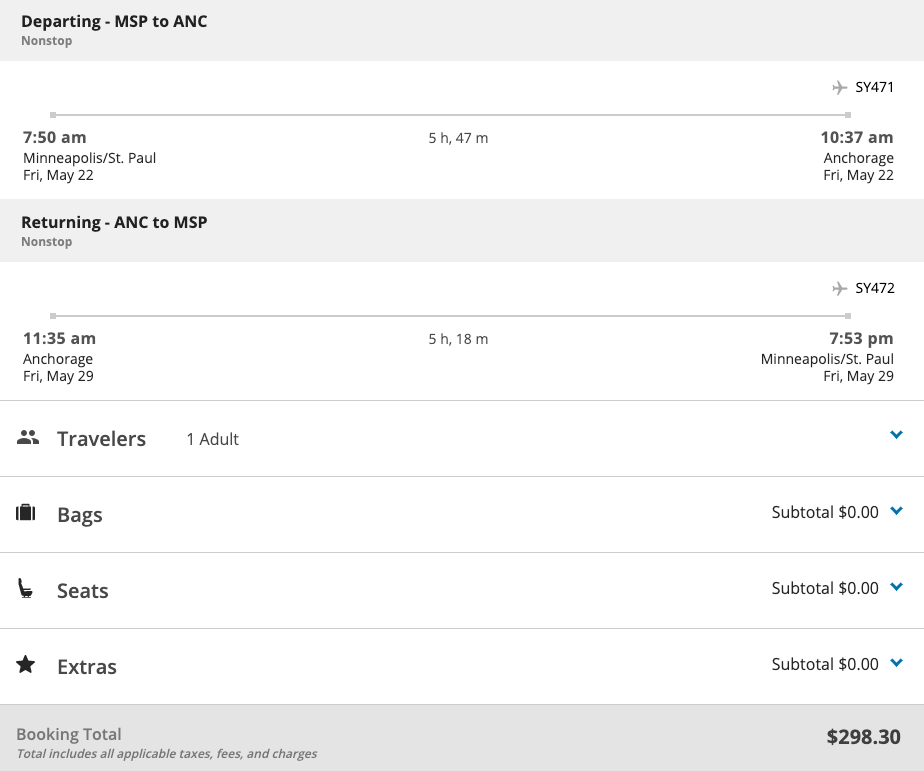 Minneapolis (MSP) to Anchorage (ANC) for $298 round-trip on Sun Country: