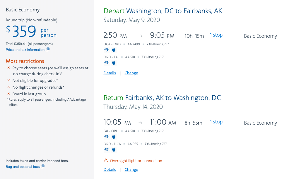 Washington, D.C. (DCA) to Fairbanks (FAI) for $343 round-trip on American: