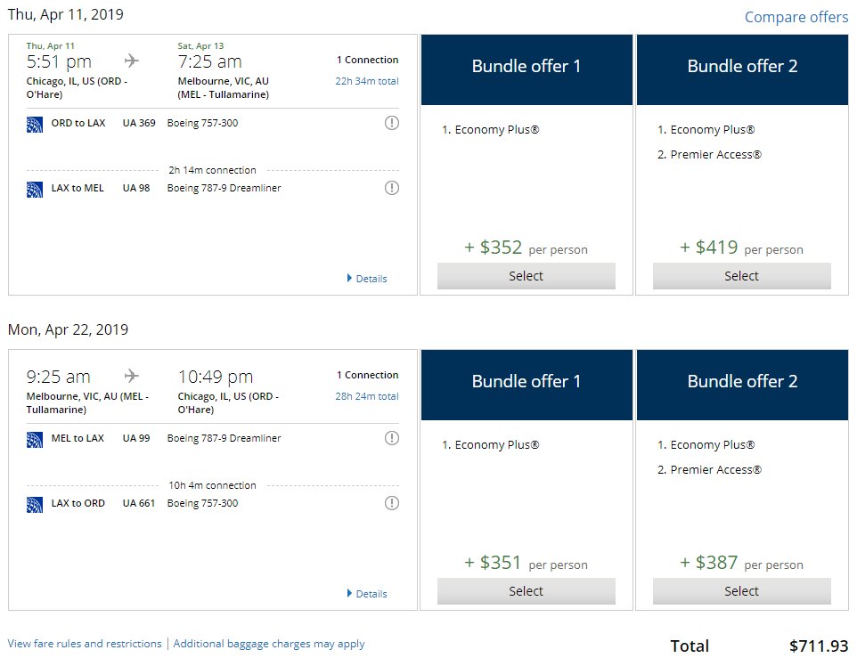 Chicago (ORD) to Melbourne (MEL) for $712 round-trip on United: