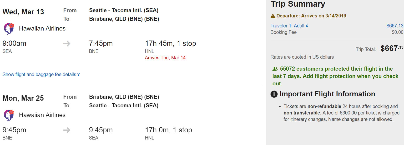 Seattle (SEA) to Brisbane (BNE) for $667 round-trip on Hawaiian: