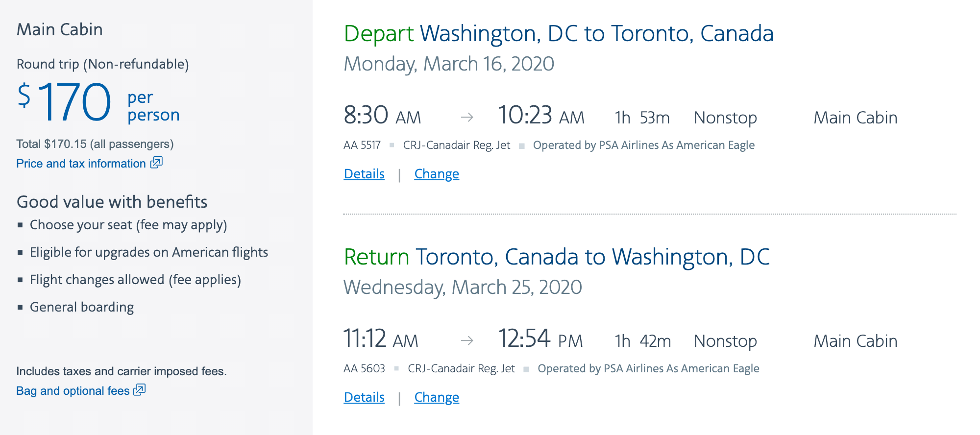 Washington DC (DCA) to Toronto (YYZ) for $170 round-trip on American: