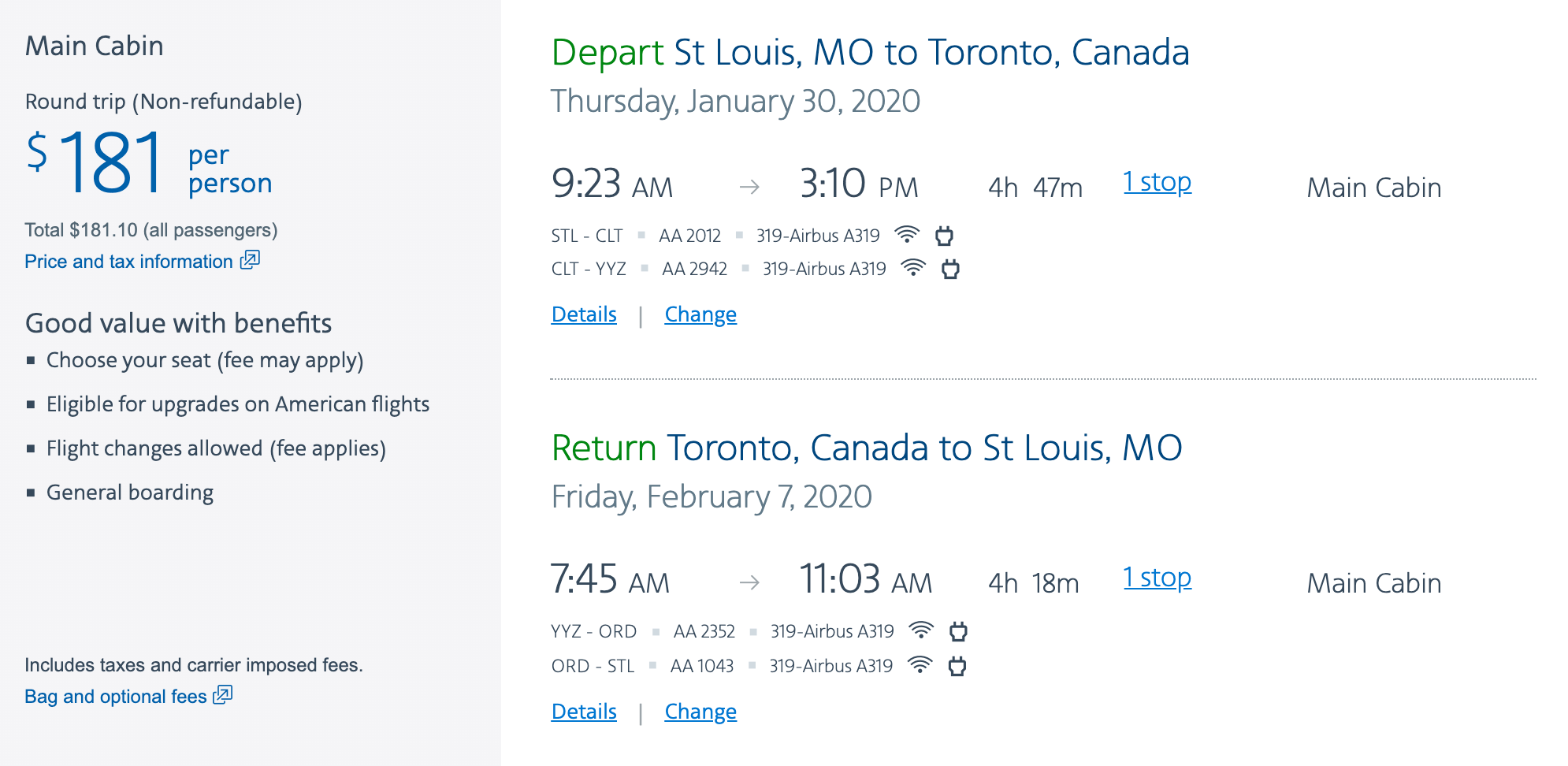 St. Louis (STL) to Toronto (YYZ) for $181 round-trip on American: