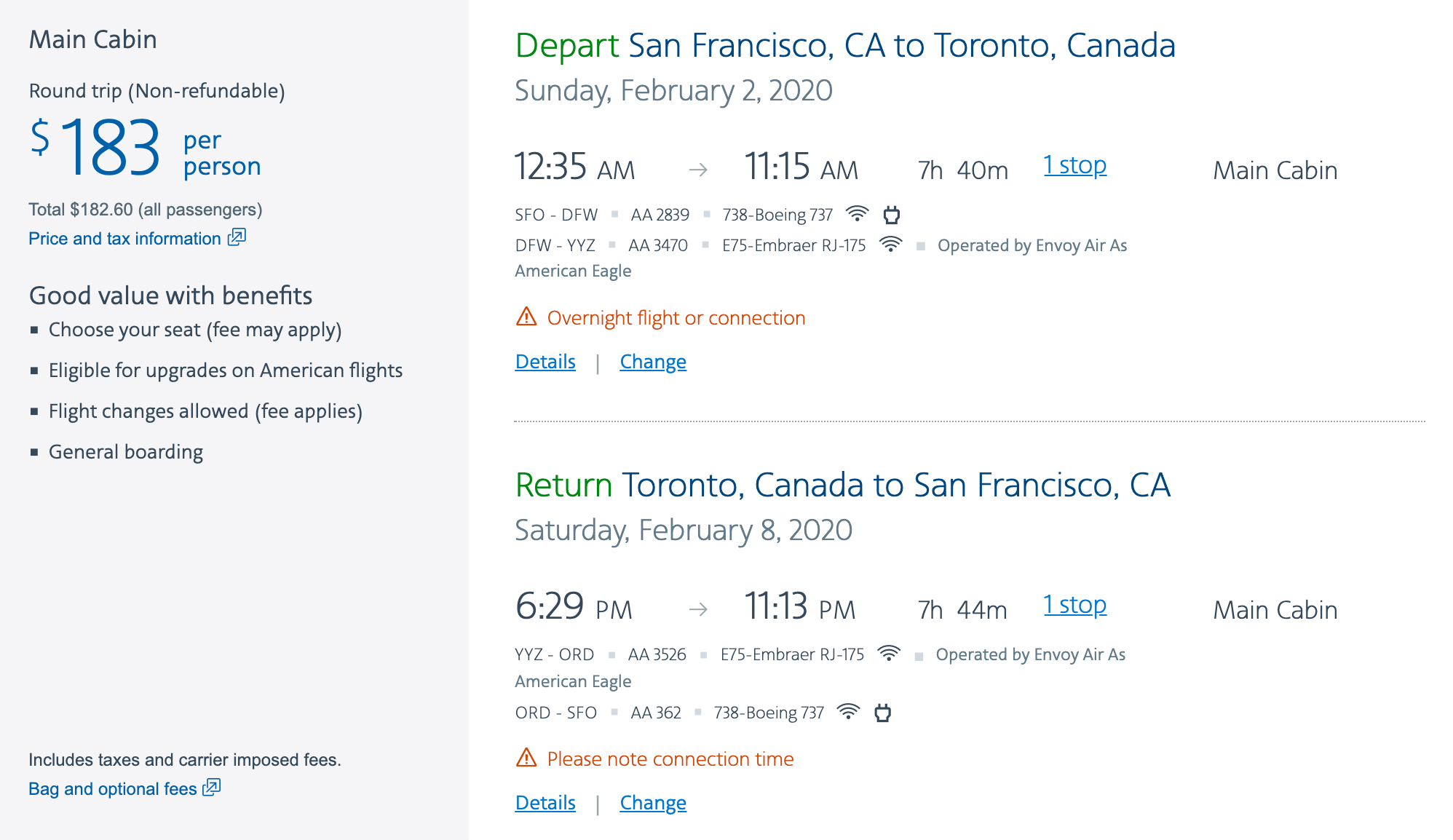 San Francisco (SFO) to Toronto (YYZ) for $183 round-trip on American: