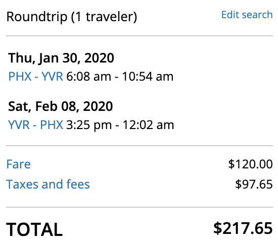 Phoenix (PHX) to Vancouver (YVR) for $218 round-trip on United:
