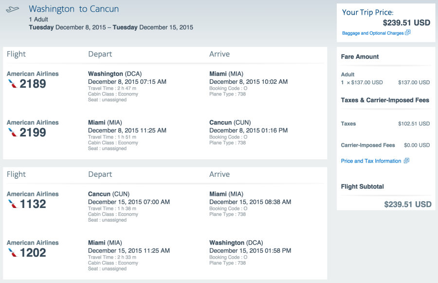 Washington (DCA) to Cancun (CUN) for $240 on American (earns 2,904 EQMs):
