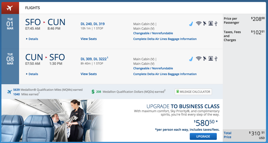 San Francisco (SFO) to Cancun (CUN) for $311 on Delta (earns 5,639 MQMs):