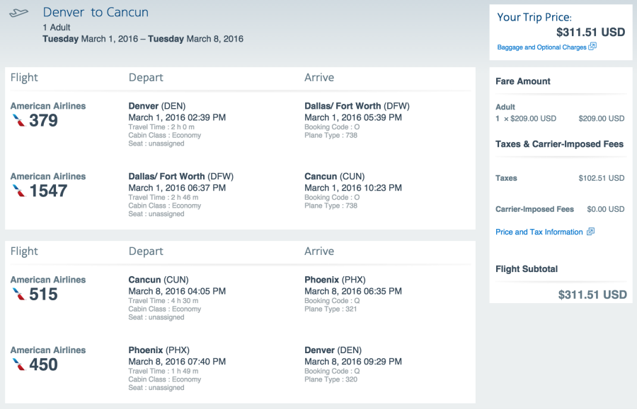 Denver (DEN) to Cancun (CUN) for $312 on American (earns 4,031 EQMs):
