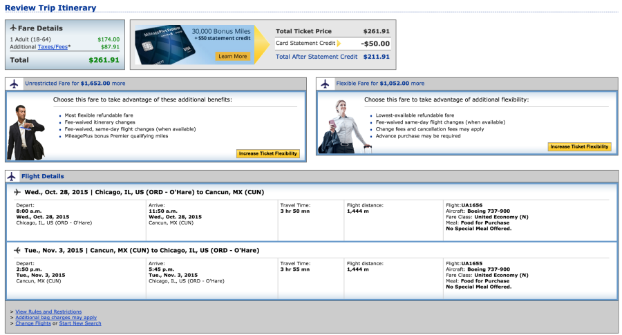 Chicago (ORD) to Cancun (CUN) for $262 on United (earns 2,888 PQMs):