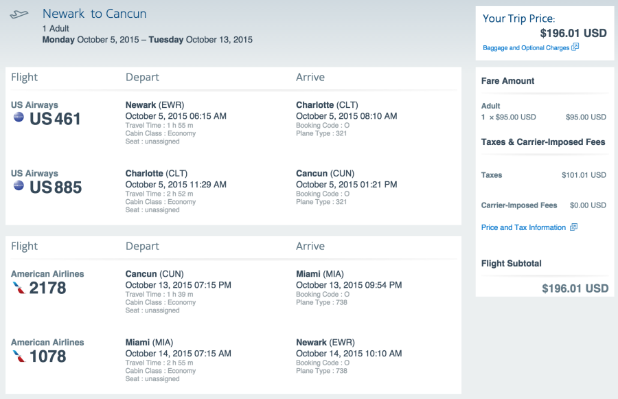 Newark (EWR) to Cancun (CUN) for $196 on American (earns 3,189 EQMs):
