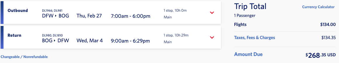 Dallas (DFW) to Bogota (BOG) for $268 round-trip on Delta:
