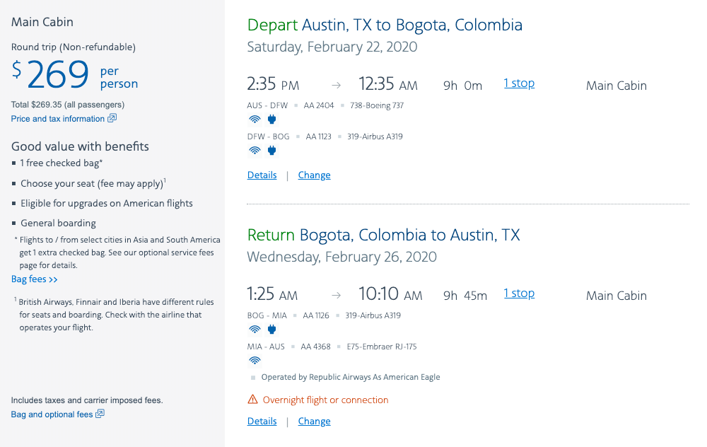 Austin (AUS) to Bogota (BOG) for $269 round-trip on American: