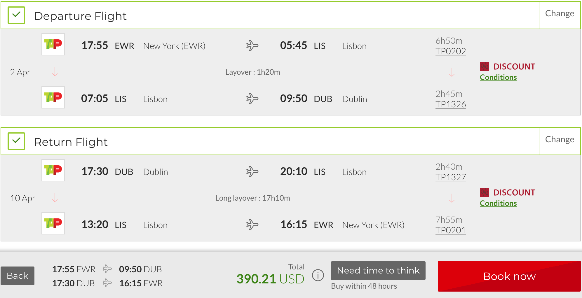 Newark (EWR) to Dublin (DUB) for $391 round-trip on TAP Air Portugal in April:
