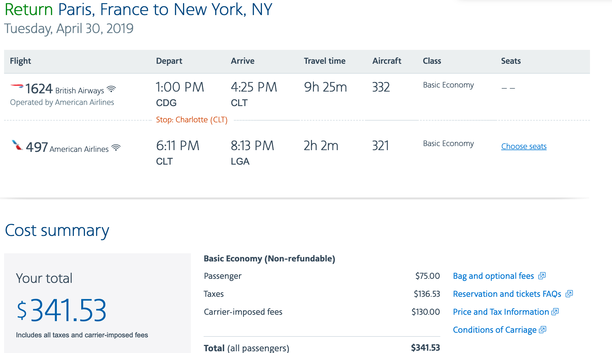New York City (JFK) to Paris (CDG) for $341 round-trip on American Airlines in April: