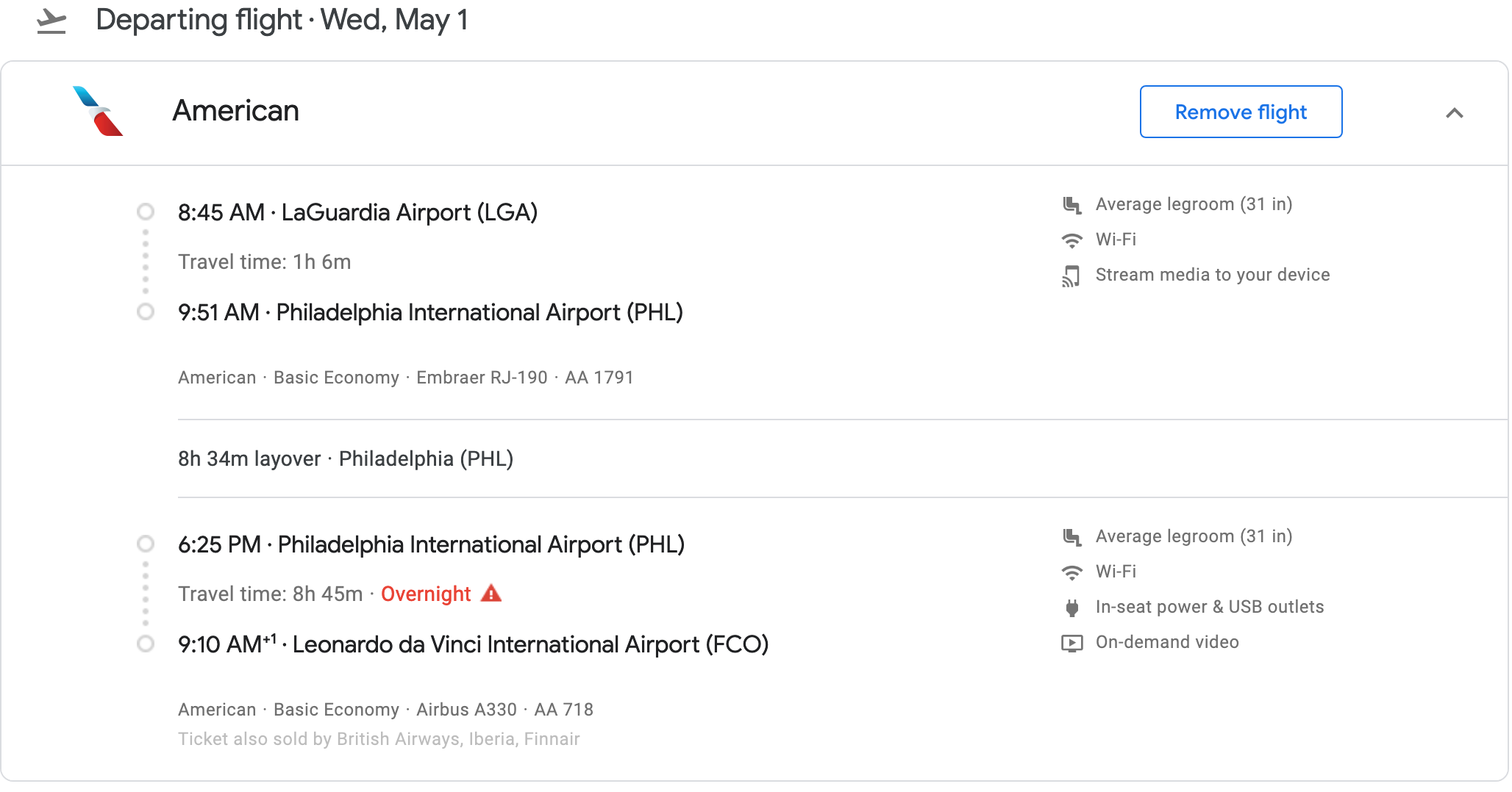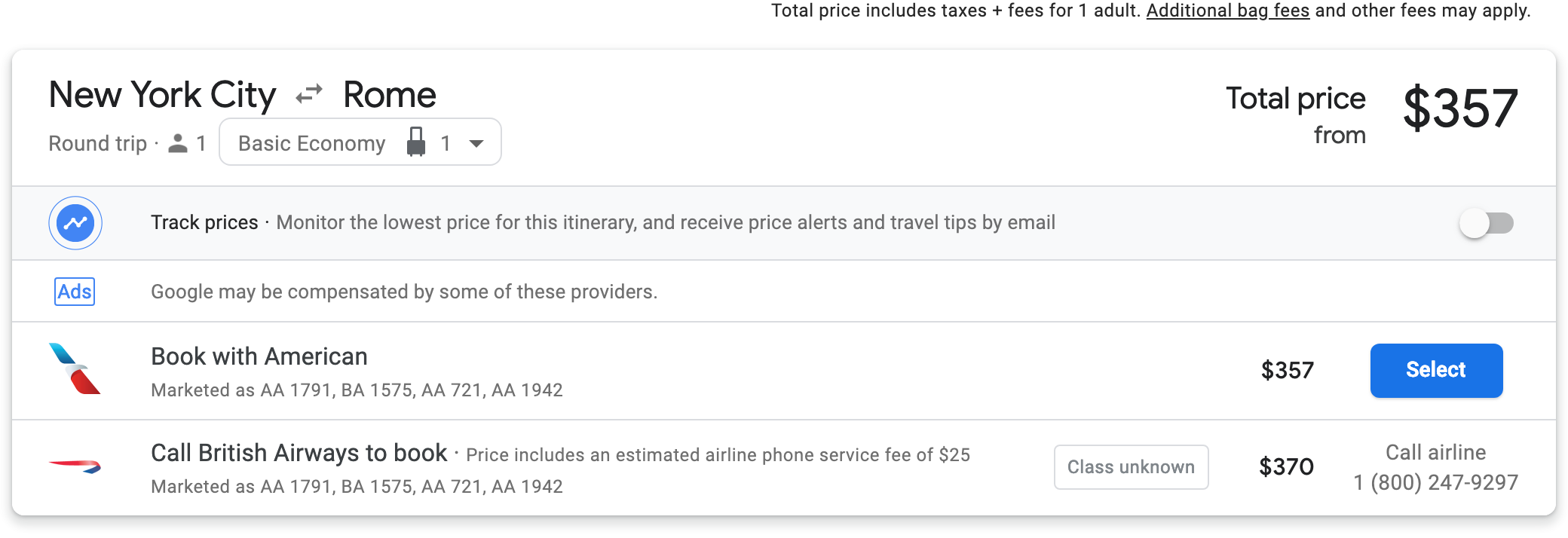 New York City (JFK) to Rome (FCO) for $357 round-trip on American Airlines in May: