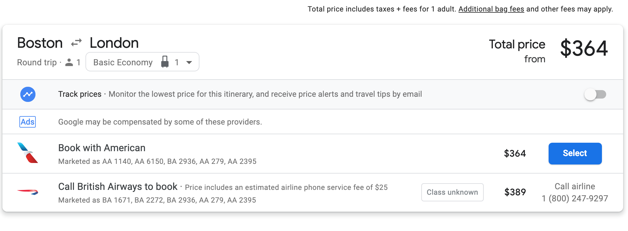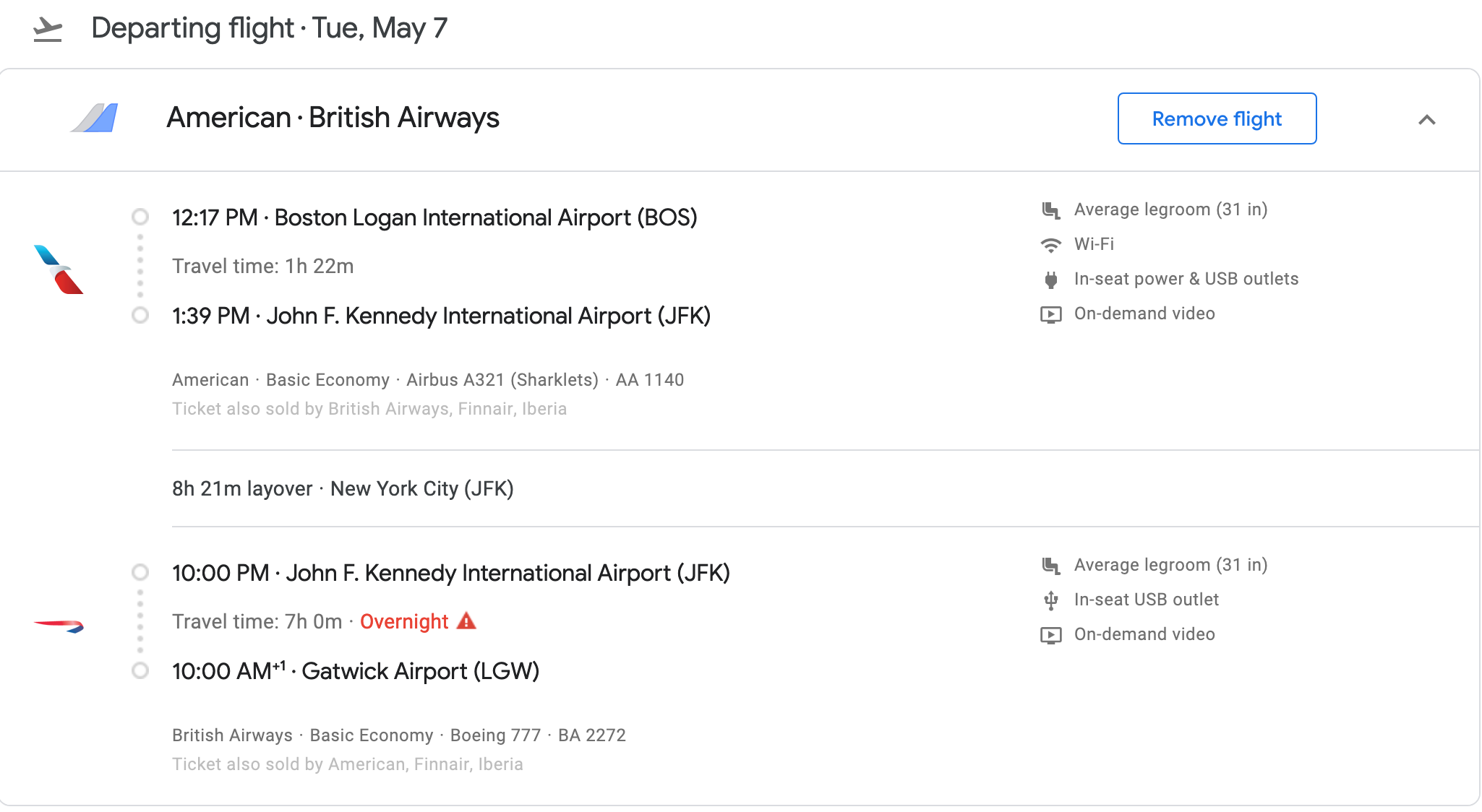 Boston (BOS) to London-Gatwick (LGW) for $363 round-trip on American Airlines, British Airways in May: