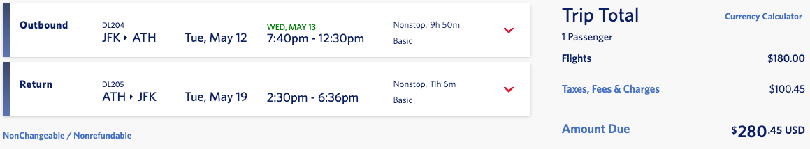 New York (JFK) to Athens (ATH) for $280 round-trip on Delta: