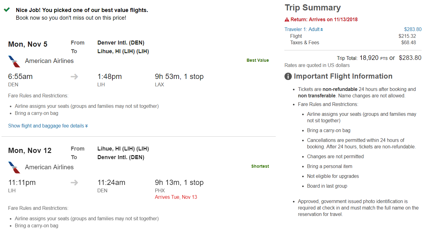 Denver (DEN) to Lihue (LIH) for $284 — or 18,920 Chase Ultimate Rewards points — round-trip in American Airlines Basic Economy: