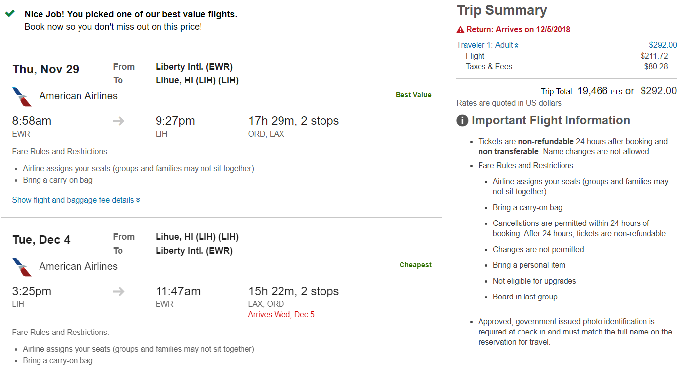 Newark (EWR) to Lihue (LIH) for $292 — or 19,466 Chase Ultimate Rewards points — round-trip in American Airlines Basic Economy: