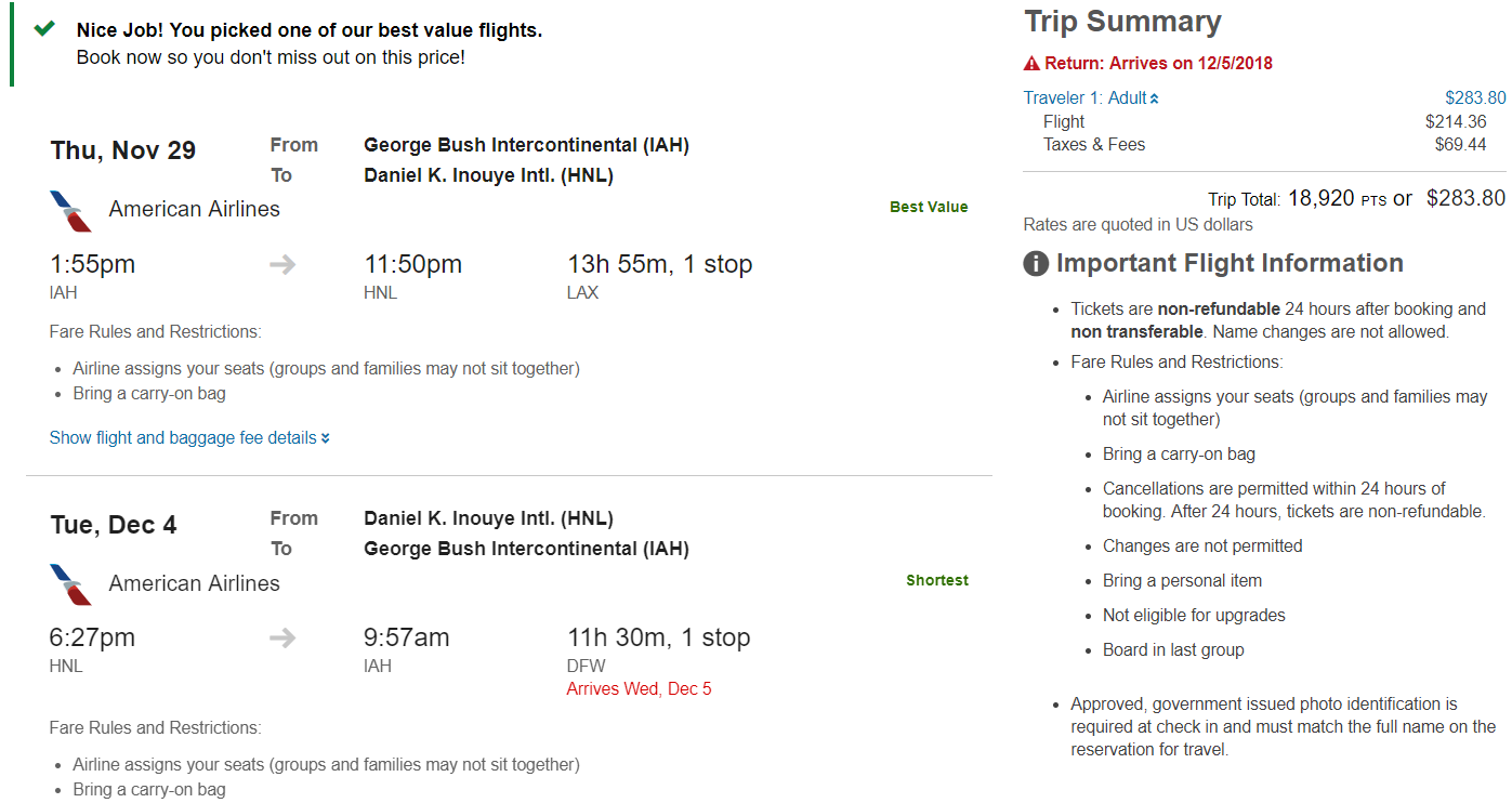 Houston Intercontinental (IAH) to Honolulu (HNL) for $284 — or 18,920 Chase Ultimate Rewards points — round-trip in American Airlines Basic Economy: