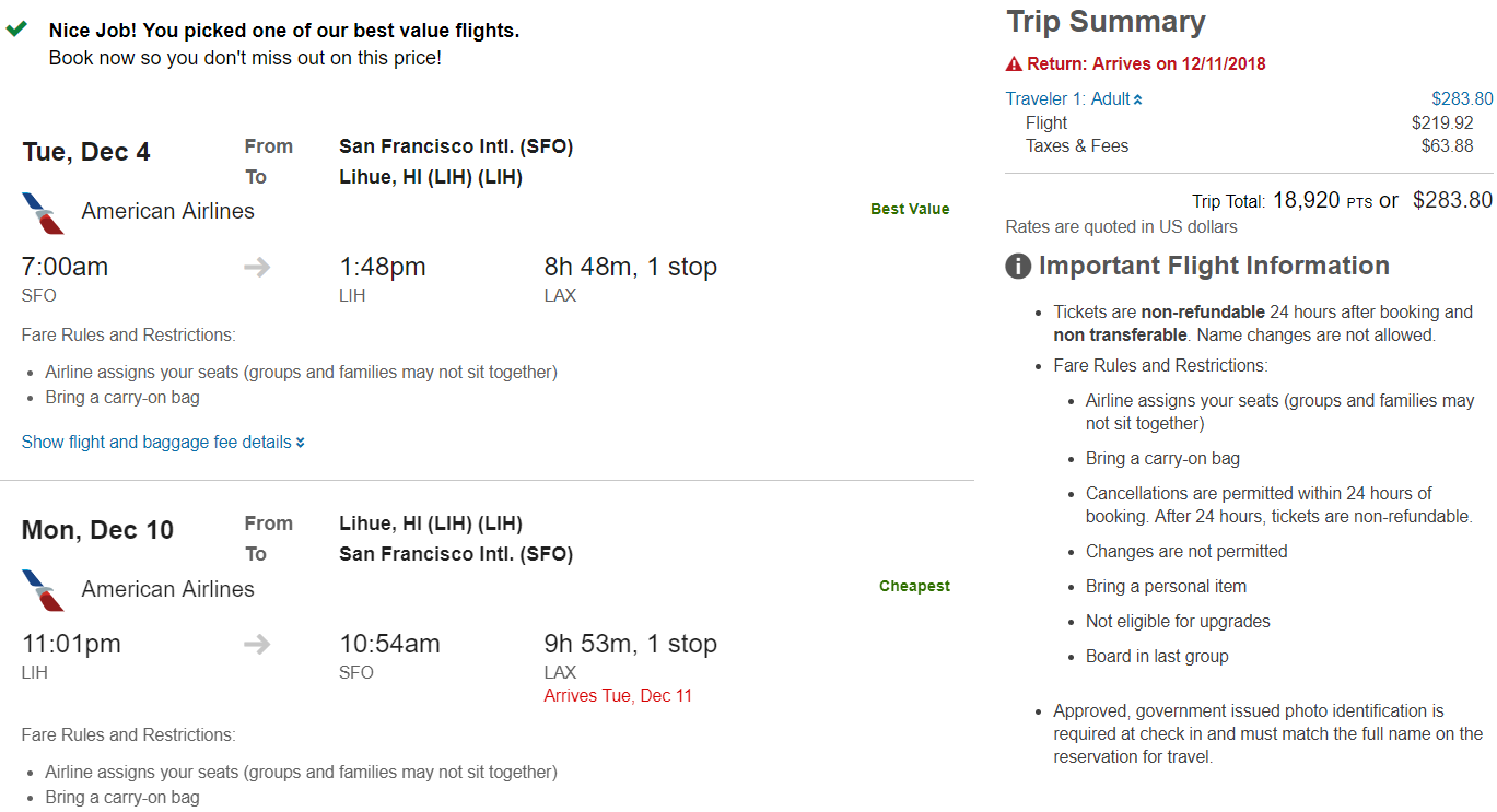 San Francisco (SFO) to Lihue (LIH) for $284 — or 18,920 Chase Ultimate Rewards points — round-trip in American Airlines Basic Economy: