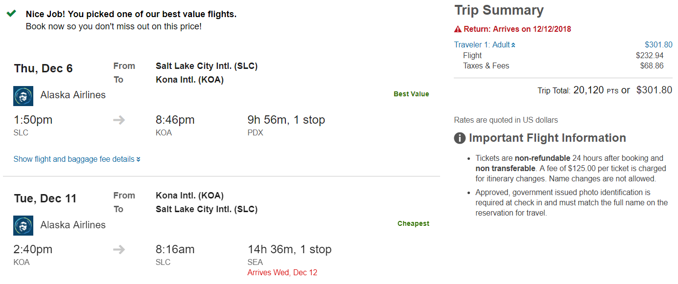 Salt Lake City (SLC) to Kona (KOA) for $302 — or 20,120 Chase Ultimate Rewards points — round-trip on Alaska Airlines: