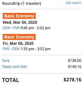 Denver (DEN) to Puerto Vallarta (PVR) for $278 round-trip on United: