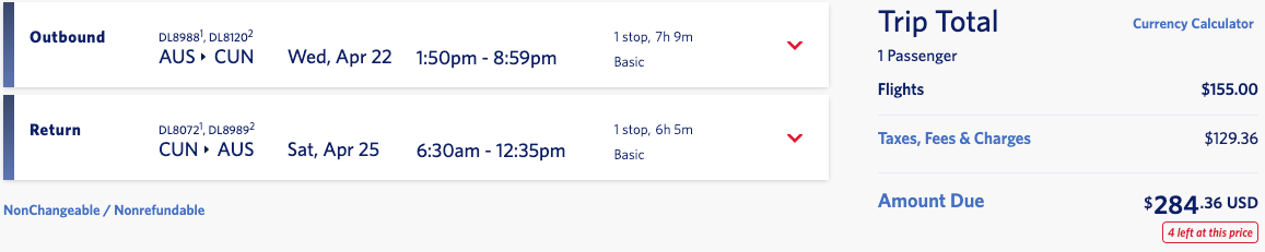 Austin (AUS) to Cancun (CUN) for $284 round-trip on Delta: