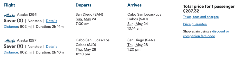 San Diego (SAN) to Cabo (SJD) for $287 round-trip on Alaska: