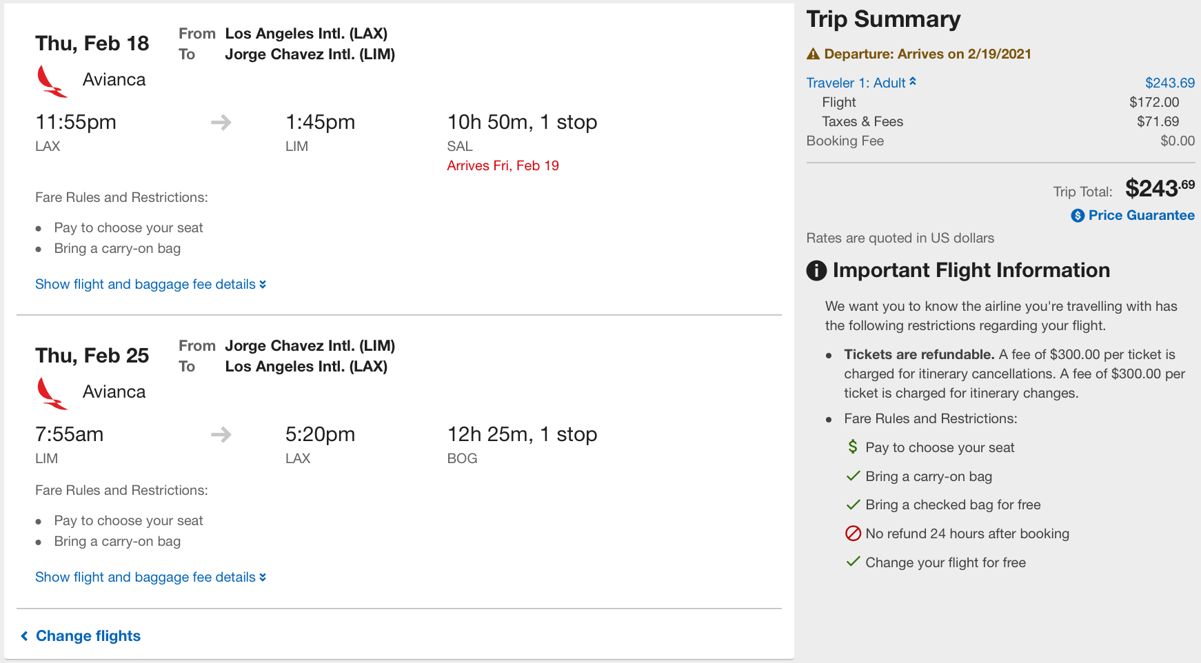 Los Angeles (LAX) to Lima (LIM) for $244 round-trip on Avianca via Orbitz: