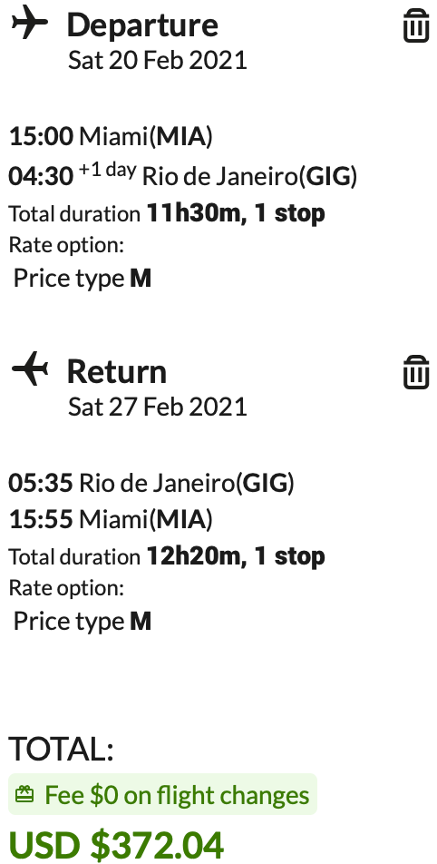 Miami (MIA) to Rio de Janeiro (GIG) for $372 round-trip on Avianca: