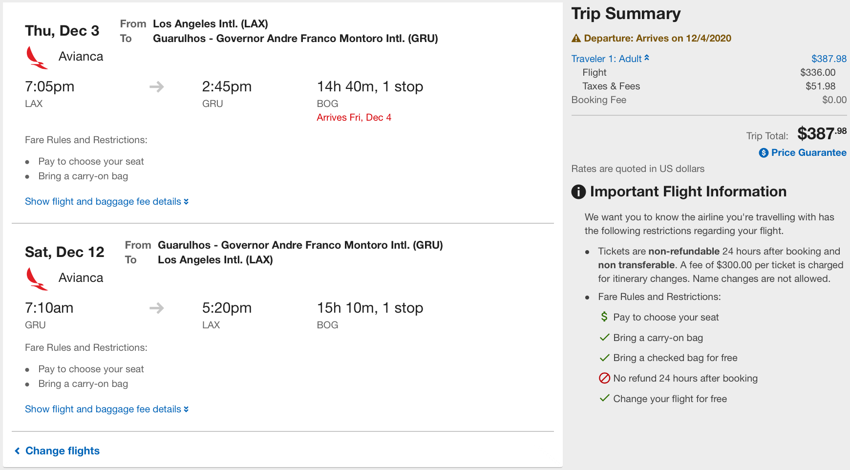 Los Angeles (LAX) to Sao Paulo (GRU) for $388 round-trip on Avianca via Orbitz: