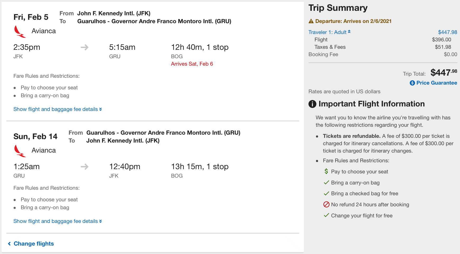 New York-JFK to Sao Paulo (GRU) for $448 round-trip on Avianca via Orbitz: