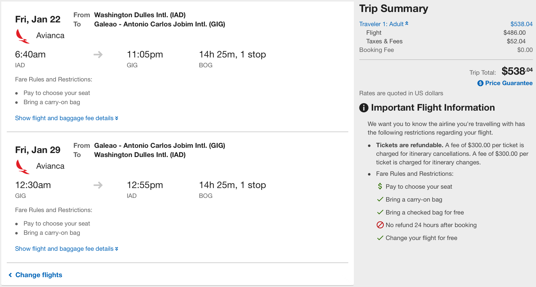 Washington-Dulles (IAD) to Rio de Janeiro (GIG) for $538 round-trip on Avianca via Orbitz: