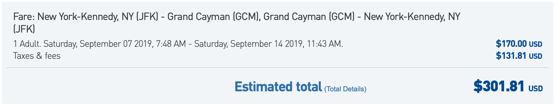 New York (JFK) to Grand Cayman (GCM) for $302 round-trip in economy on JetBlue: