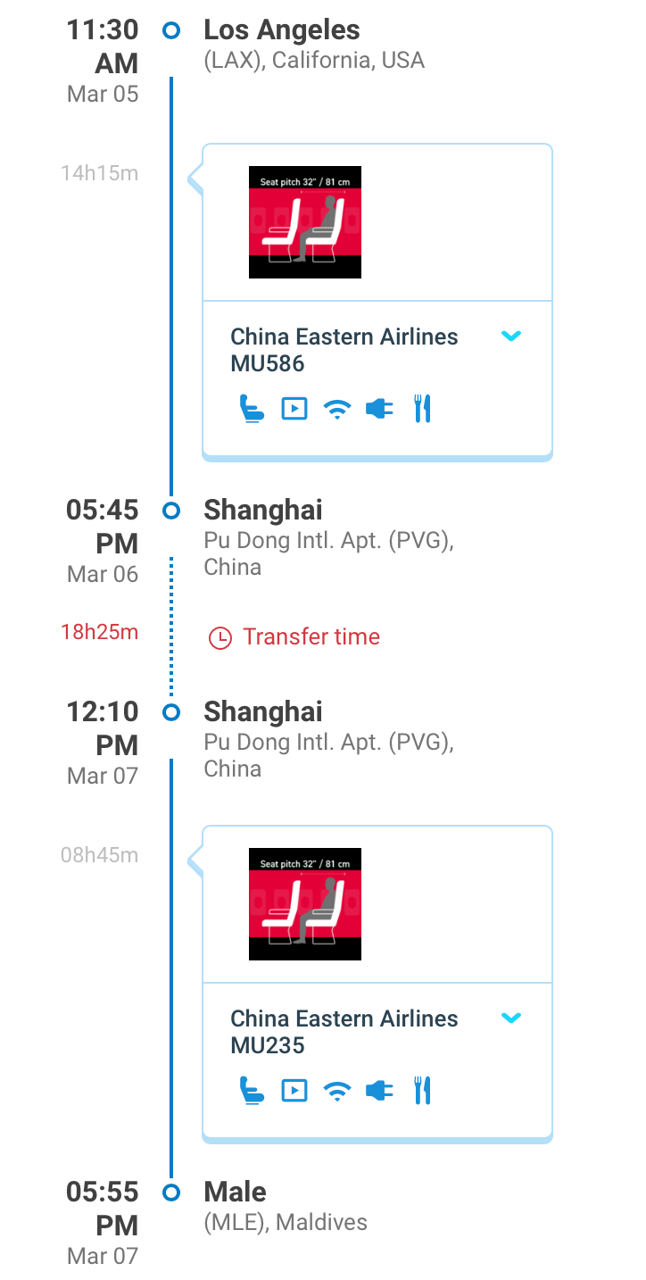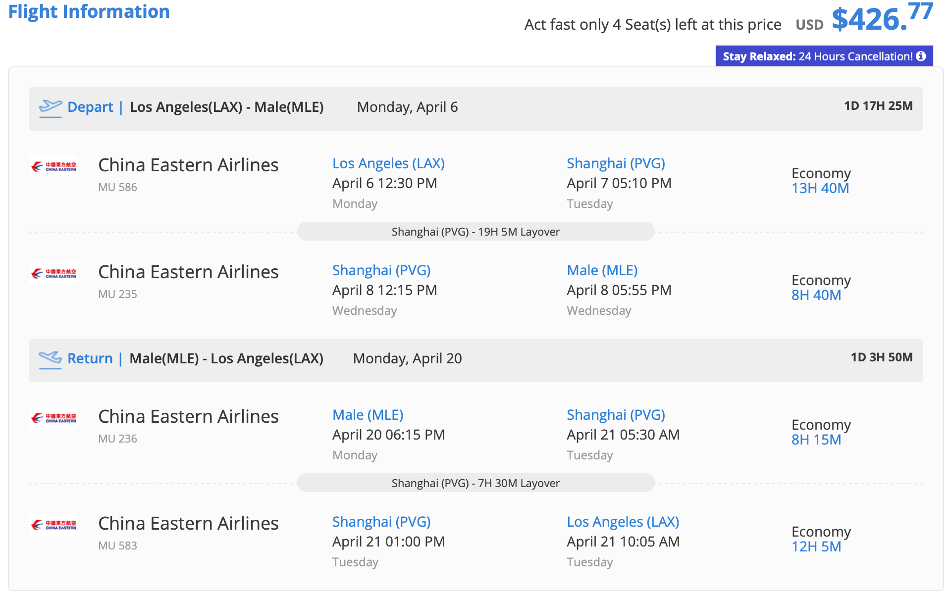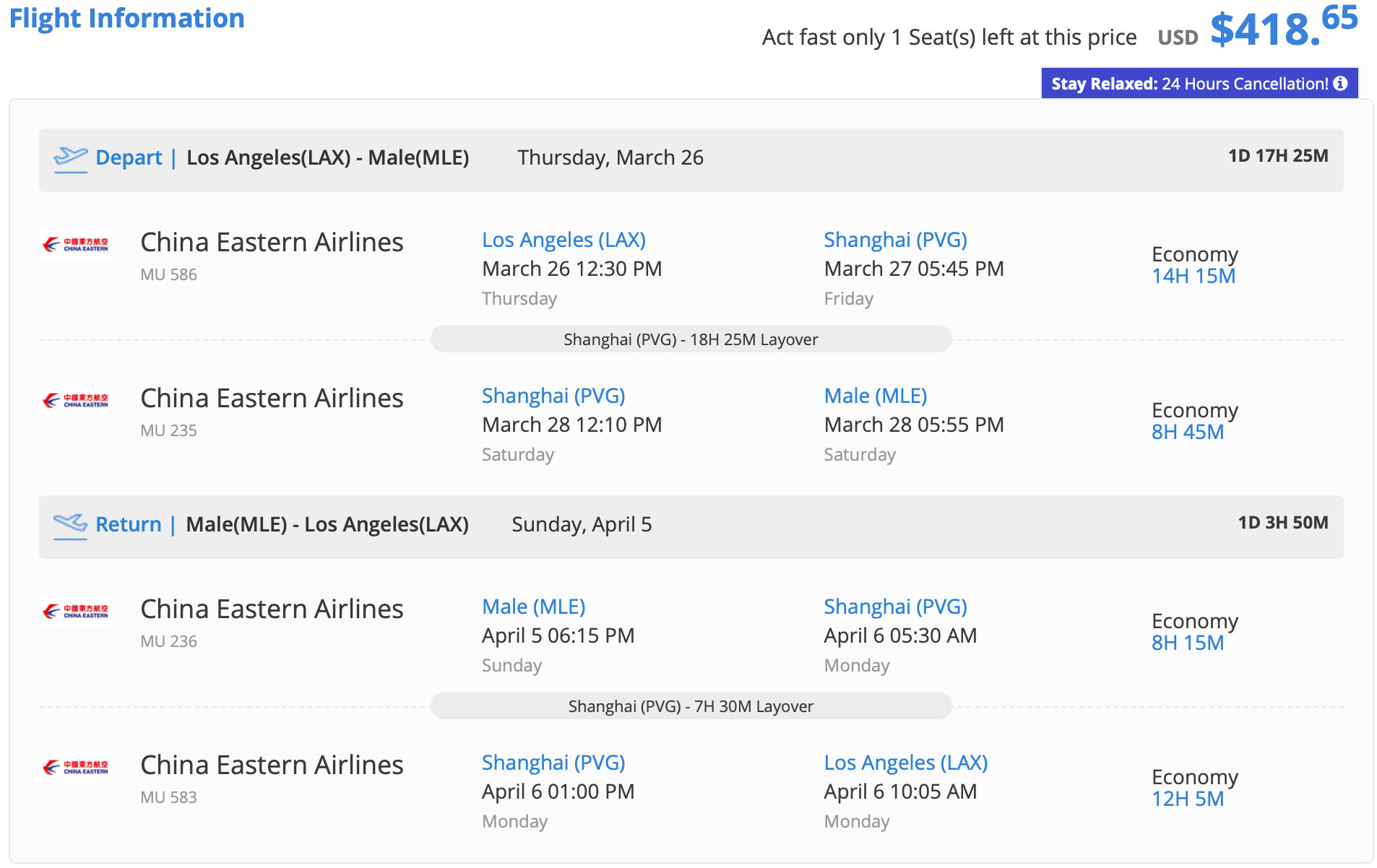 It's always a great day when we find cheap deals to the Maldives. We're seeing flights from Los Angeles (LAX) to Malé (MLE) starting at just $418 round-trip on SkyTeam member China Eastern.