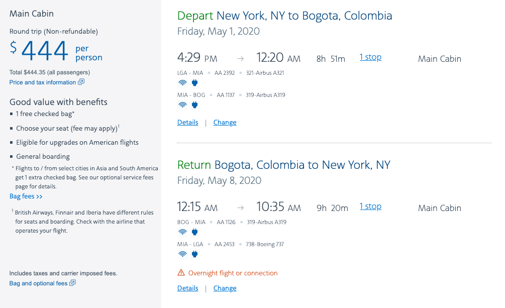 New York (JFK) to Bogota (BOG) for $444 round-trip on American: