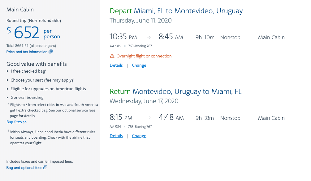 Miami (MIA) to Montevideo (MVD) for $652 round-trip on American: