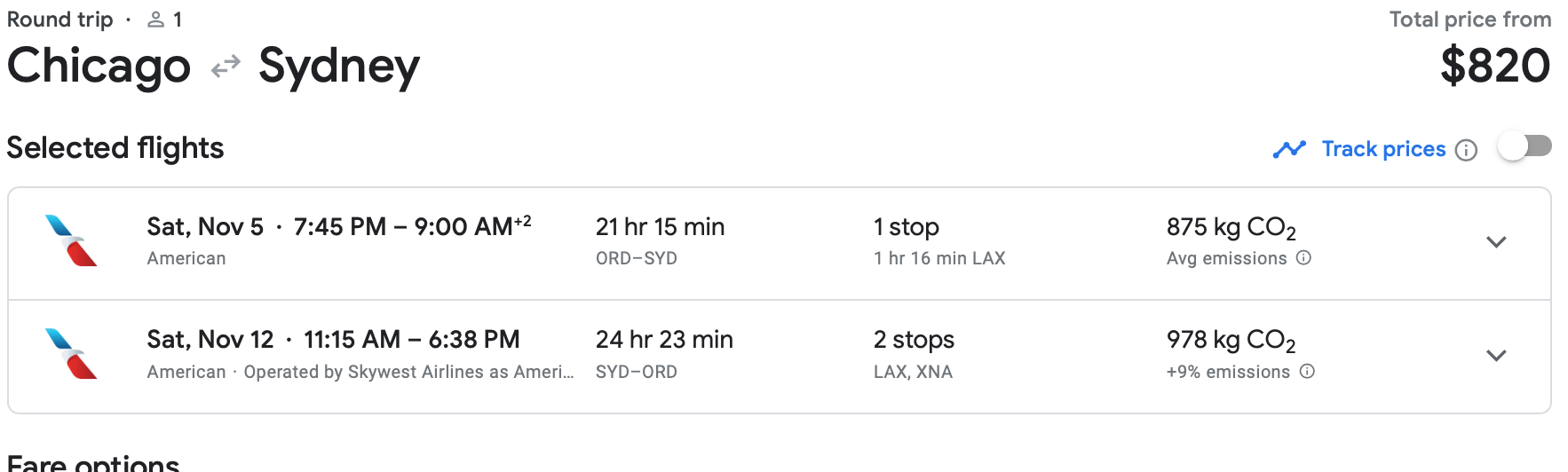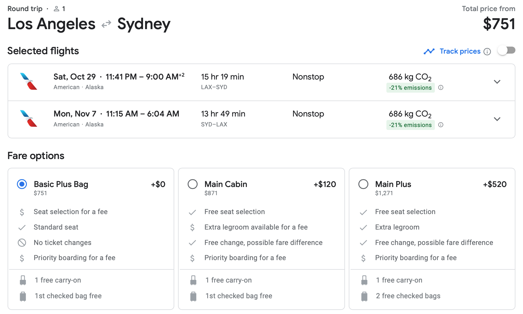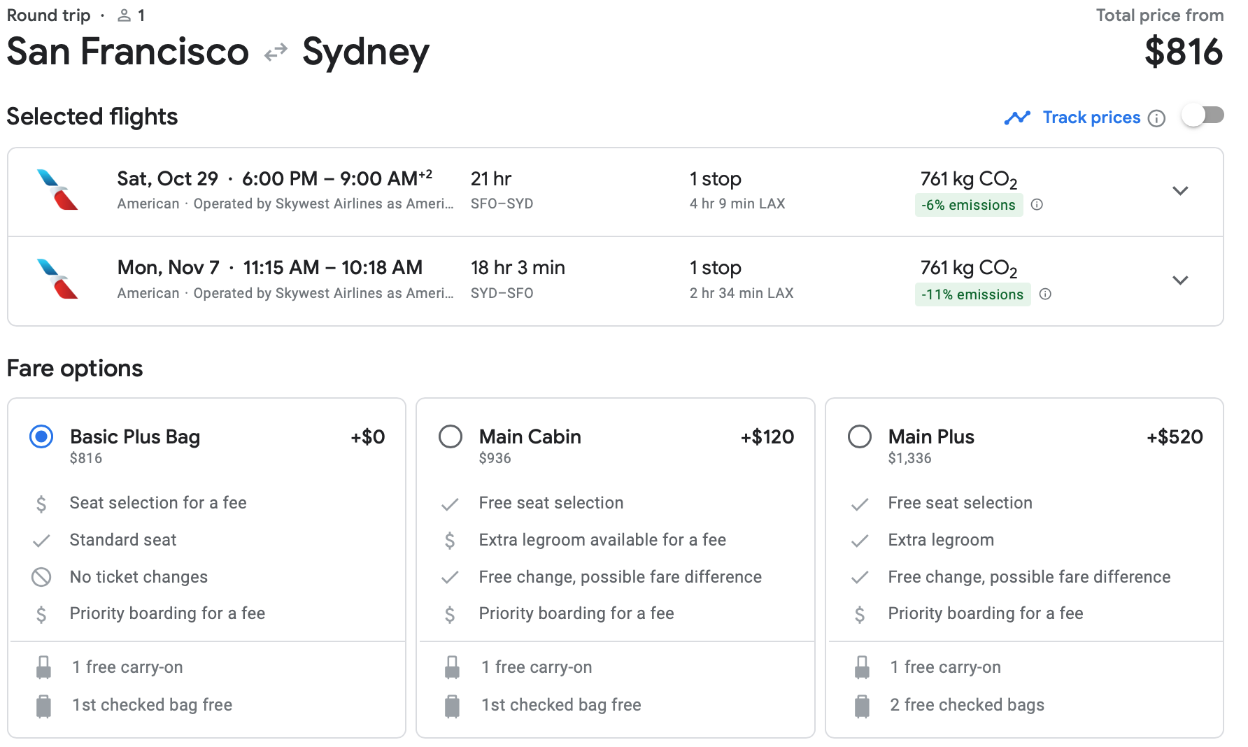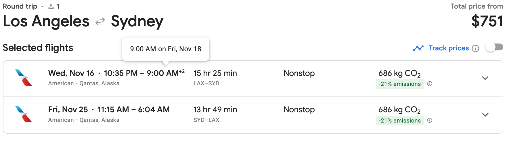 We'll end with a nonstop flight on American from Los Angeles International Airport (LAX) to Sydney in late October for only $751. That's an incredible price.