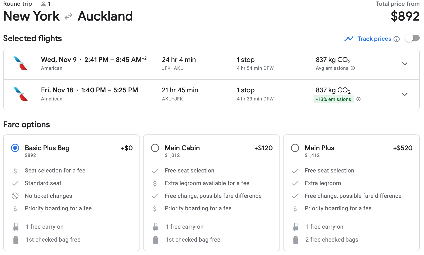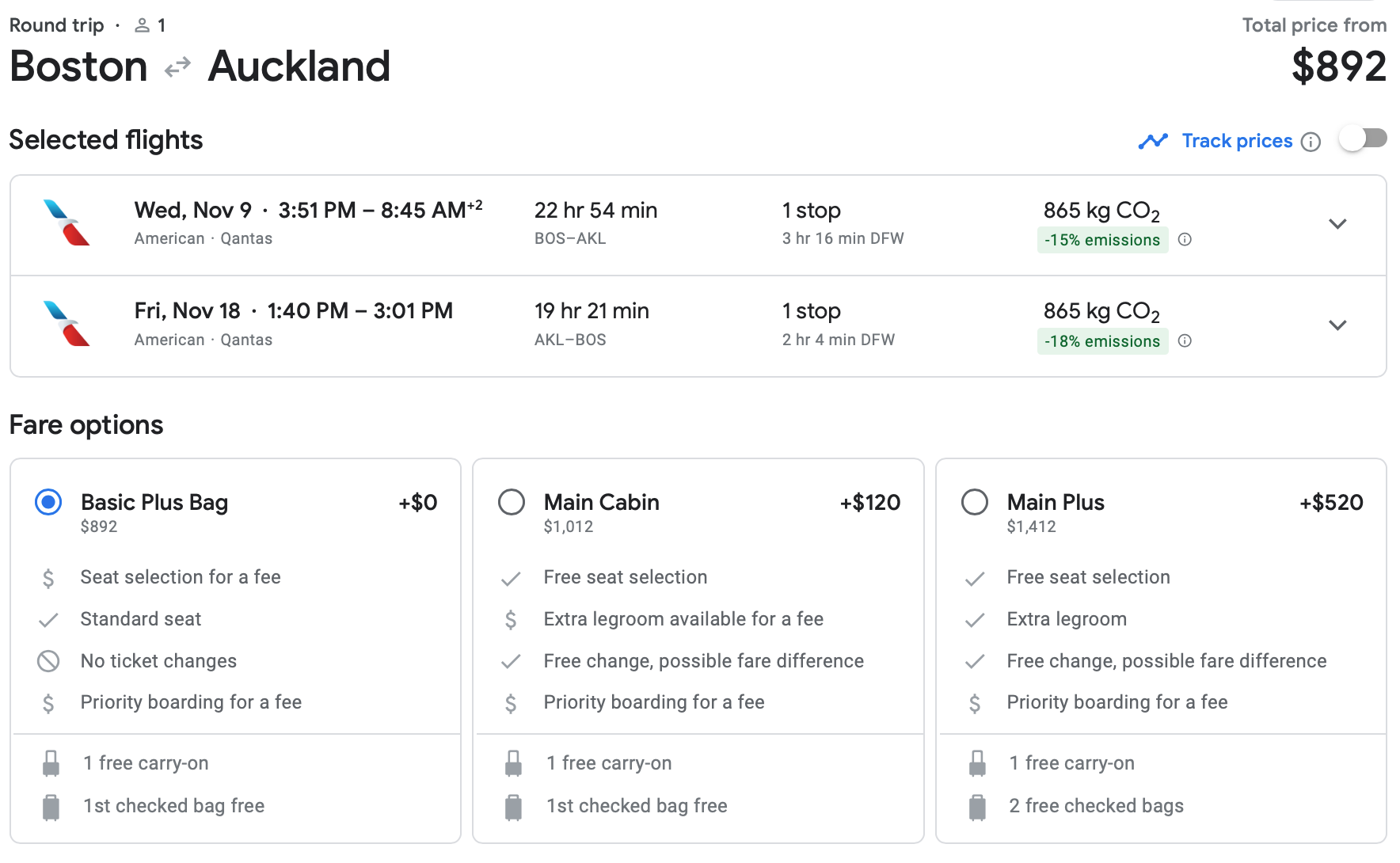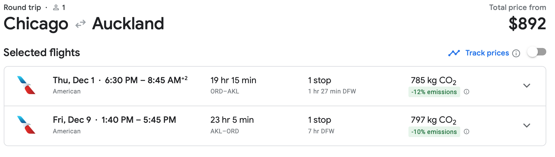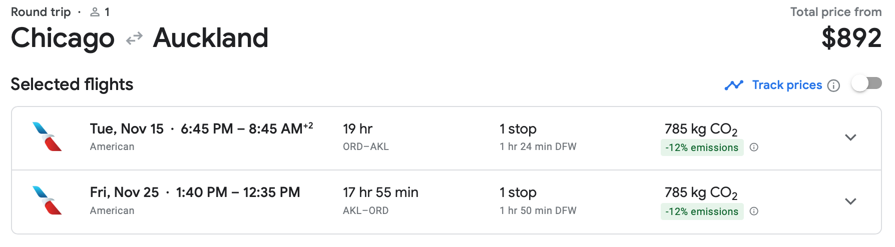 American has flights to Auckland from Boston Logan International Airport (BOS) in November for the same price. If you live in Boston, November is really your best shot to score a sub-$1,000 ticket to New Zealand as availability has dried up in October and December.
