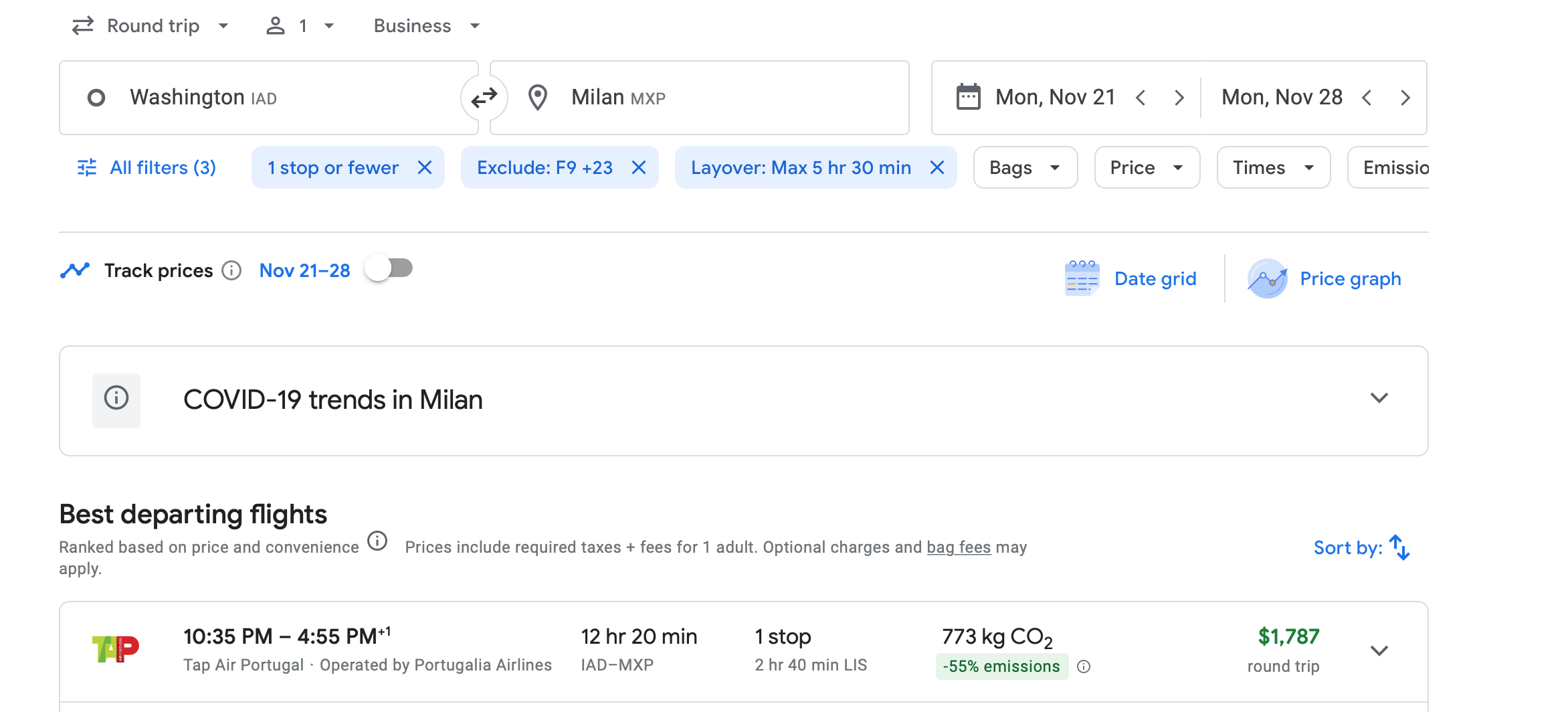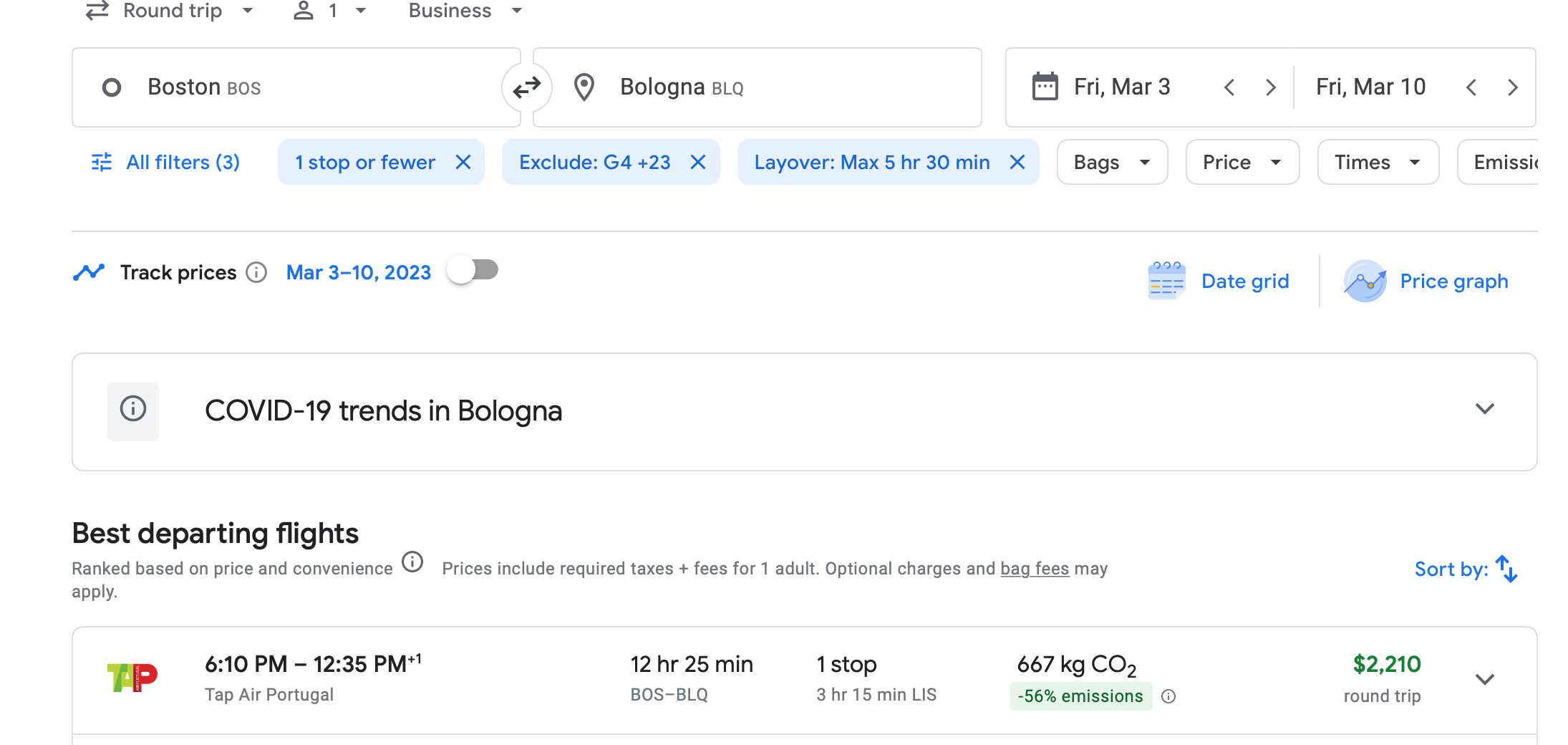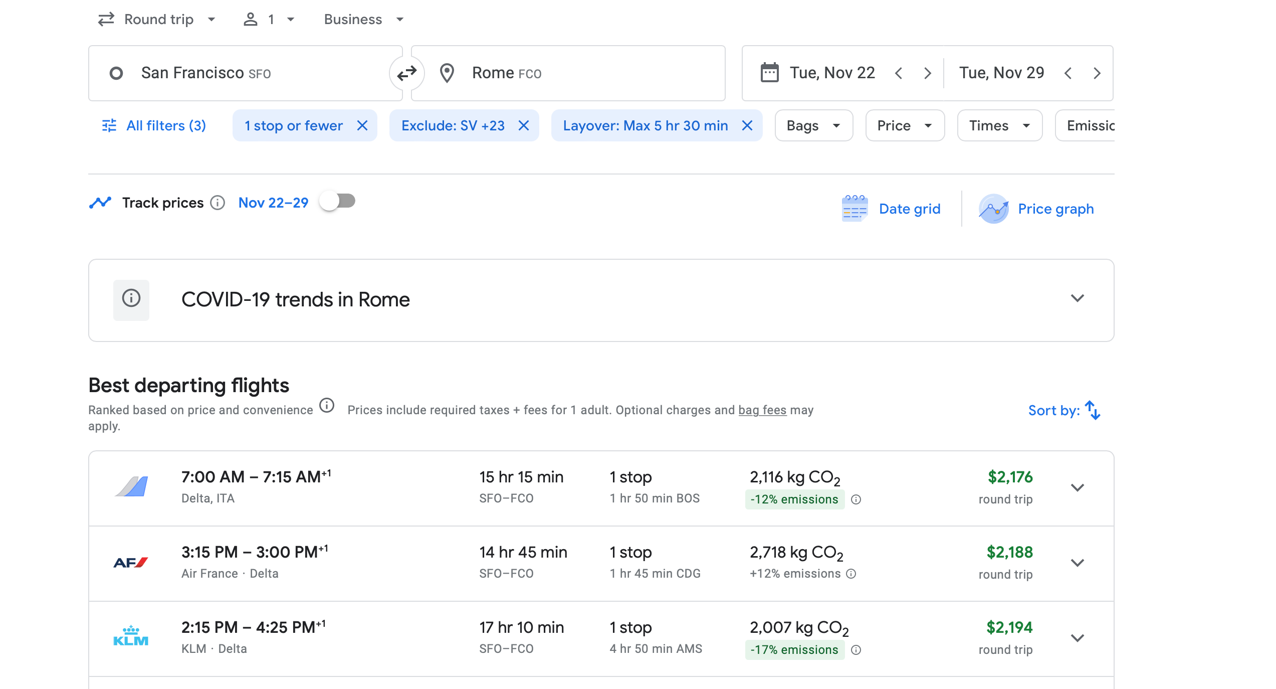 Another route with strong discounts and multiple airline options is this San Francisco to Rome option for less than $2,200 — a savings of nearly 40% off regular business-class fares.