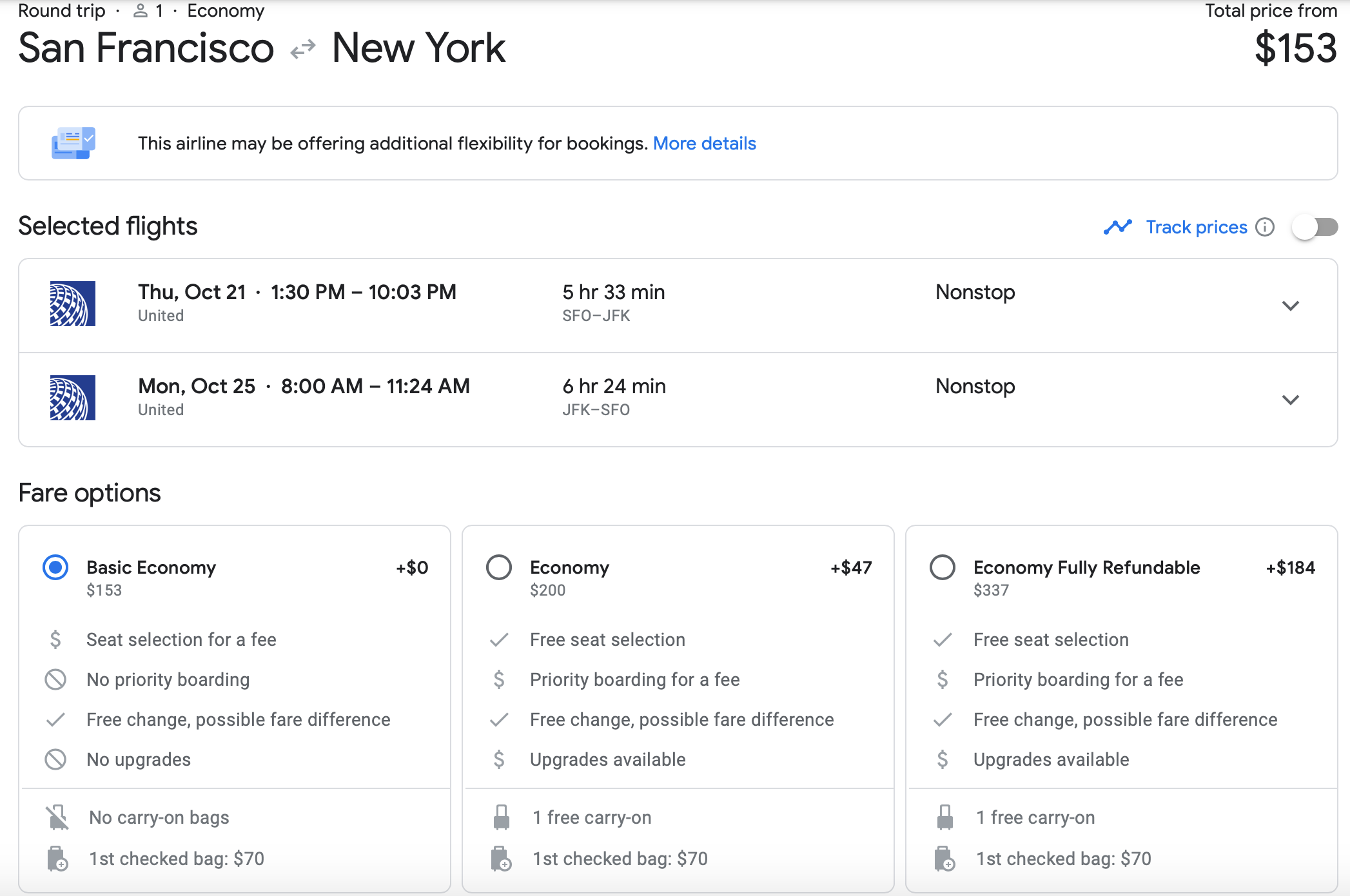 Another excellent deal we found was San Francisco to NYC via United for just $153 roundtrip. Again, it's a basic economy fare so you don't get the option of a free carry-on bag, but for just $47 you can upgrade one level and get the free carry-on. That's $23 cheaper than it would cost you to check a bag at the lower fare rate.
