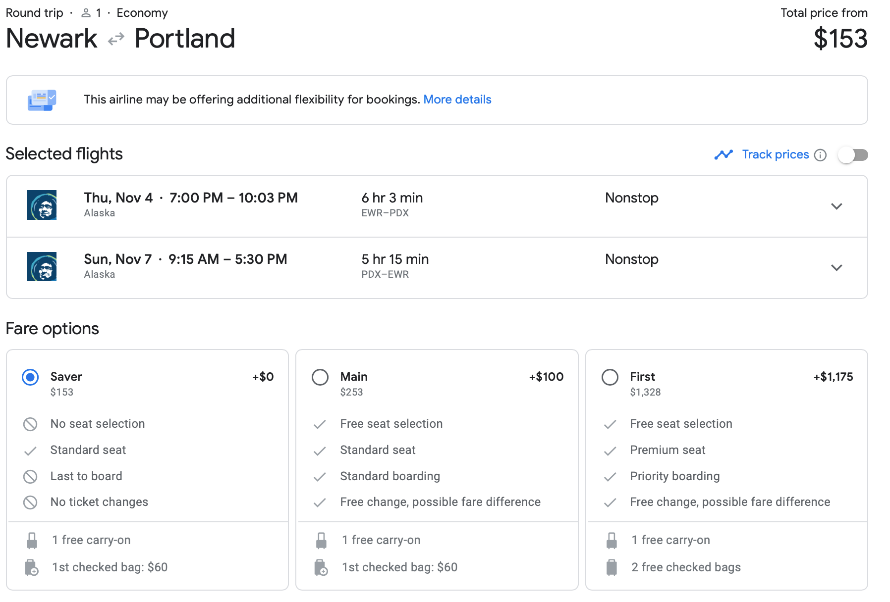 Different cities, same low price. Newark to Portland, Oregon is available for $153 nonstop via Alaska Air.