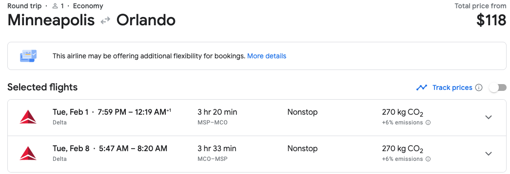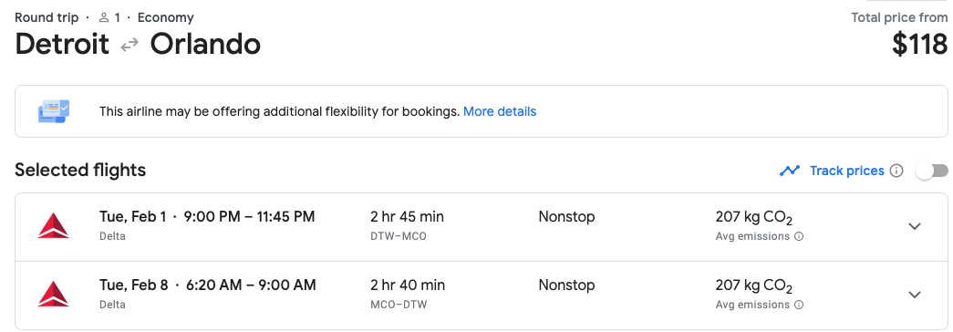 Similarly, you can find the same priced Delta flight to Orlando out of Detroit on February 1, where the same fare cabin rules apply.
