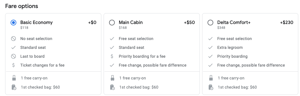 This flight is in Delta's basic economy cabin, which includes one free carry-on. A checked bag will cost you $60 and you can upgrade to the main cabin for $50 to choose your seat.